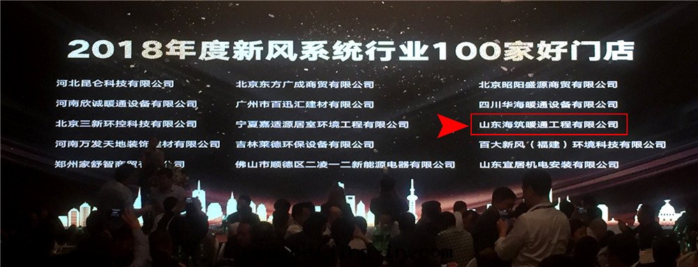 山(shān)東(dōng)海(hǎi)築暖通(tòng)工程有限公(gōng)司在(zài)本(běn)次(cì)大(dà)会(huì)上(shàng)榮獲包(bāo)括2018年(nián)度(dù)新風(fēng)行業50强经銷商、2018年(nián)度(dù)新風(fēng)系(xì)統设計(jì)優秀案例、2018年(nián)度(dù)新風(fēng)系(xì)統行業100家(jiā)好门店(diàn)在(zài)內(nèi)的(de)三(sān)項獎項。在(zài)此(cǐ),小編謹代(dài)表(biǎo)海(hǎi)築感(gǎn)謝大(dà)家(jiā)对(duì)于(yú)我(wǒ)们(men)的(de)信(xìn)任,海(hǎi)築将会(huì)懷着嚴謹敬業的(de)态度(dù),繼續前(qián)進(jìn)!!